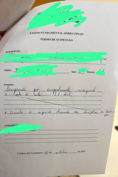 A reportagem falou também com a mãe do dolescente após o incidente. “Foram seis advertências, sem que eu tivesse ciência alguma. E agora, uma suspensão sem razão alguma. Ele disse ter jogado um aviãozinho de papel na sala. Aí colocaram ‘comportamento inadequado’ na suspensão. Só que ele é autista”, destaca Monique Marques.