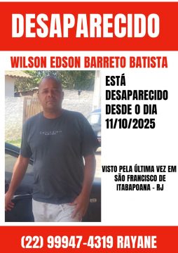 Familiares de Wilson Edson Barreto Batista, de 55 anos, morador de Atafona, em São João da Barra, seguem em busca de informações sobre seu paradeiro. Ele foi levado à força durante uma invasão a uma residência na localidade de Praça João Pessoa, em São Francisco de Itabapoana, na manhã de sábado (11).