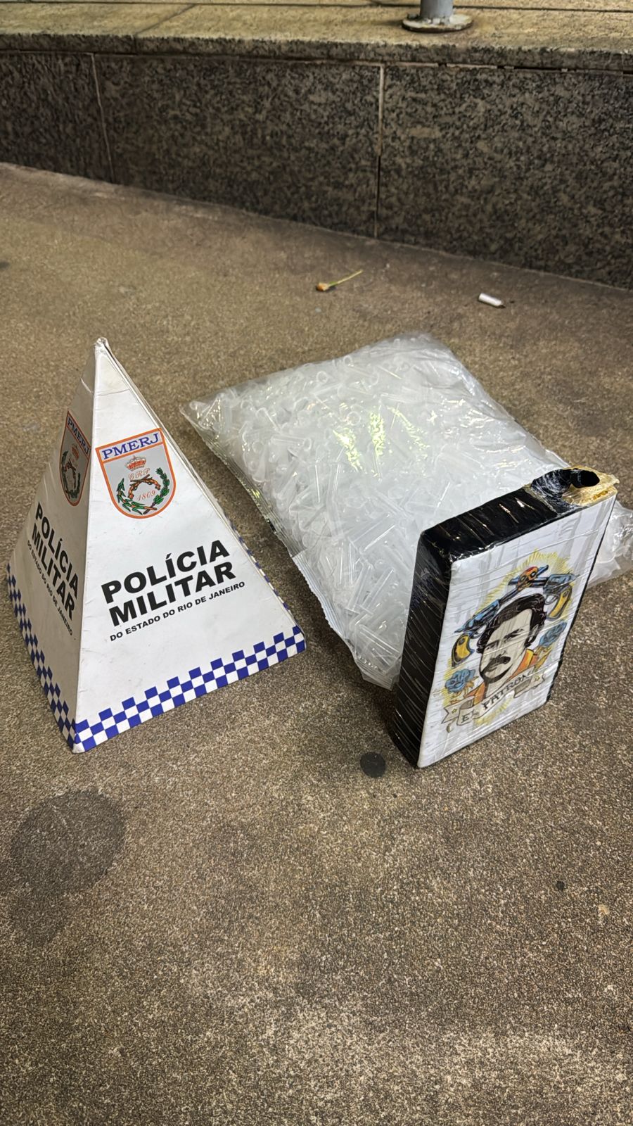 No local, foram encontrados um saco branco, com um tablete de pasta base de cocaína de aproximadamente 1 kg, e um saco transparente com 1000 pinos vazios, comumente utilizados para endolação da droga.