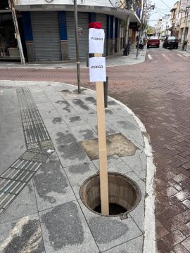 Para evitar acidentes, os lojistas improvisaram uma sinalização de alerta no local, tentando chamar a atenção de quem passa a pé pela via movimentada. “A qualquer momento alguém pode se machucar. Muita gente anda distraída e não percebe o buraco”, relatou um comerciante.