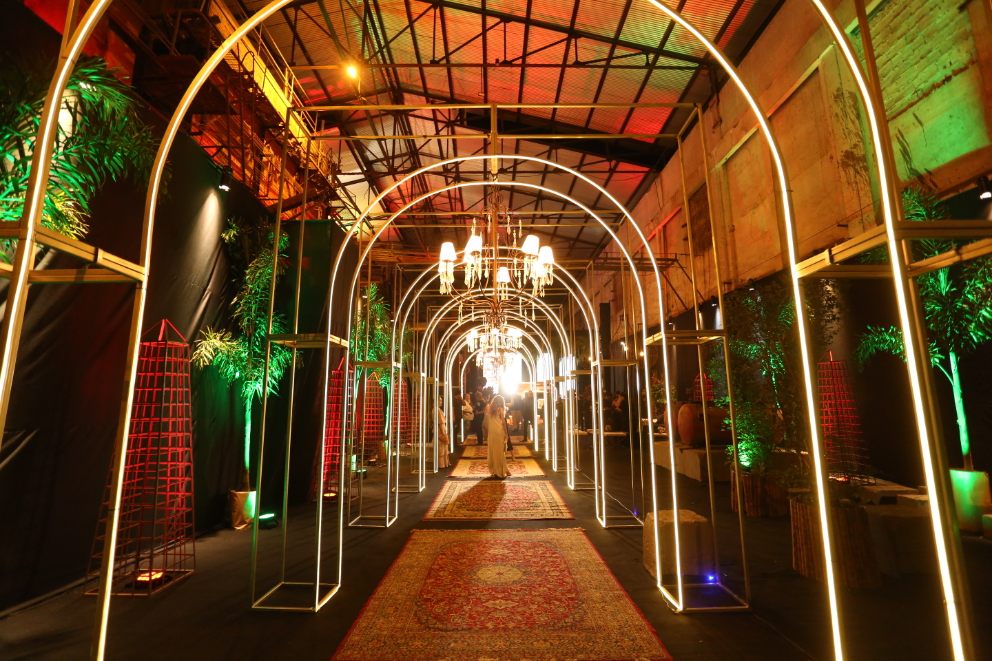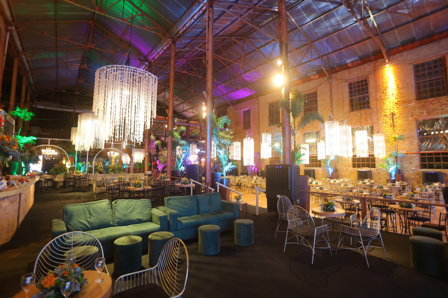 Em mais um ano, o projeto cenográfico da festa levou a assinatura do decorador João Ibrahim, que apostou em combinações contemporâneas. o fundo preto e os tons terrosos dominaram o ambiente, com pontos de luz neon e cristais criando uma atmosfera que juntava o estilo industrial original com a modernidade e conforto.
