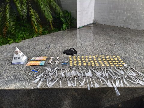 Segundo a PM, as equipes realizaram uma ação na localidade conhecida como Beco do Chave, área apontada como ponto de venda de drogas e sob domínio de uma facção criminosa. No local, os policiais apreenderam 80 sacolés e 14 pinos de cocaína, 62 buchas de maconha, 9 porções de skank, 51 pedras de crack e R$ 286 em dinheiro.
