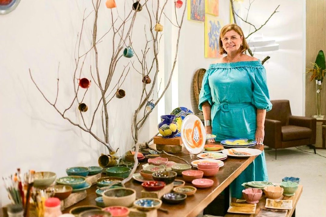 A artesã Carla Sobral recebendo parabéns pelo seu trabalho exposto no simpósio Caminhos de Barro, realizado na Universidade Estadual do Norte Fluminense (Uenf). Sua obra toda em cerâmica começou com um hobby, mas ganhou primeiros músculos de arte e agora chegam os devidos elogios pela sensibilidade em cada item.