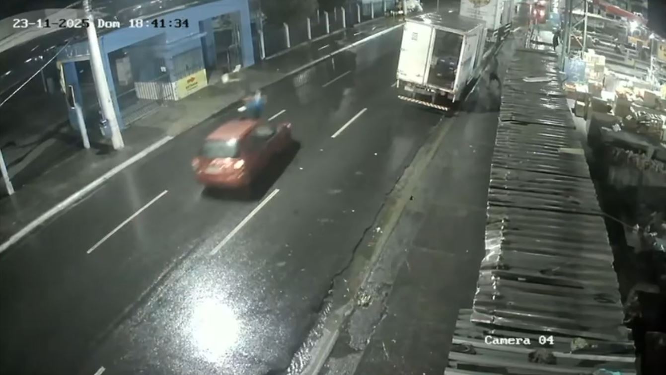 Uma câmera de vigilância flagrou o momento do atropelamento de um homem de 55 anos em frente ao Mercado Municipal, na Avenida José Alves de Azevedo, na noite de domingo (23). A vítima atravessava a rua, fora da faixa de pedestres, quando foi atingida por um carro.