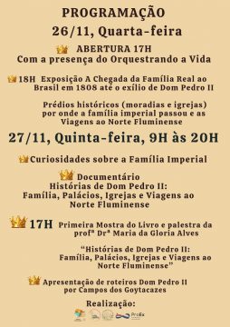 Na programação, exposição sobre a chegada da Família Real ao Brasil em 1808 até o exílio de Dom Pedro II, fotos e vídeos de prédios históricos (moradias e igrejas) por onde a Família Imperial passou, as viagens ao Norte Fluminense e a primeira mostra do livro Histórias de Dom Pedro II: Família, Palácios, Igrejas e Viagens ao Norte Fluminense, da professora Maria da Gloria Alves.