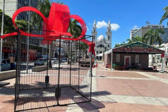 Nos últimos dias, a praça virou um canteiro de preparação. A decoração reúne a árvore de Natal de LED, presépio, iluminação e a Casa do Papai Noel. Este ano, artistas locais também participam da montagem. Grafiteiros e profissionais ligados ao carnaval trabalham nas peças do presépio, desenhando e fazendo intervenções ali mesmo, ao ar livre.