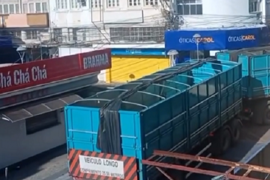 Uma carreta de aproximadamente 30 metros ficou travada no Centro de Campos por volta das 7h desta terça-feira (9), ao avançar pelo prolongamento da Avenida Sete de Setembro e tentar seguir, pela contramão, para a Rua Teotônio Ferreira de Araújo. O veículo já estava na área do Calçadão quando não conseguiu completar a manobra. A passagem veículos ficou prejudicada por cerca de uma hora, segundo pessoas que estavam no local. Uma placa de identificação de ruas chegou a ser quebrada. Prefeitura afirma que não houve acionamento da Guarda Civil Municipal. Veja.