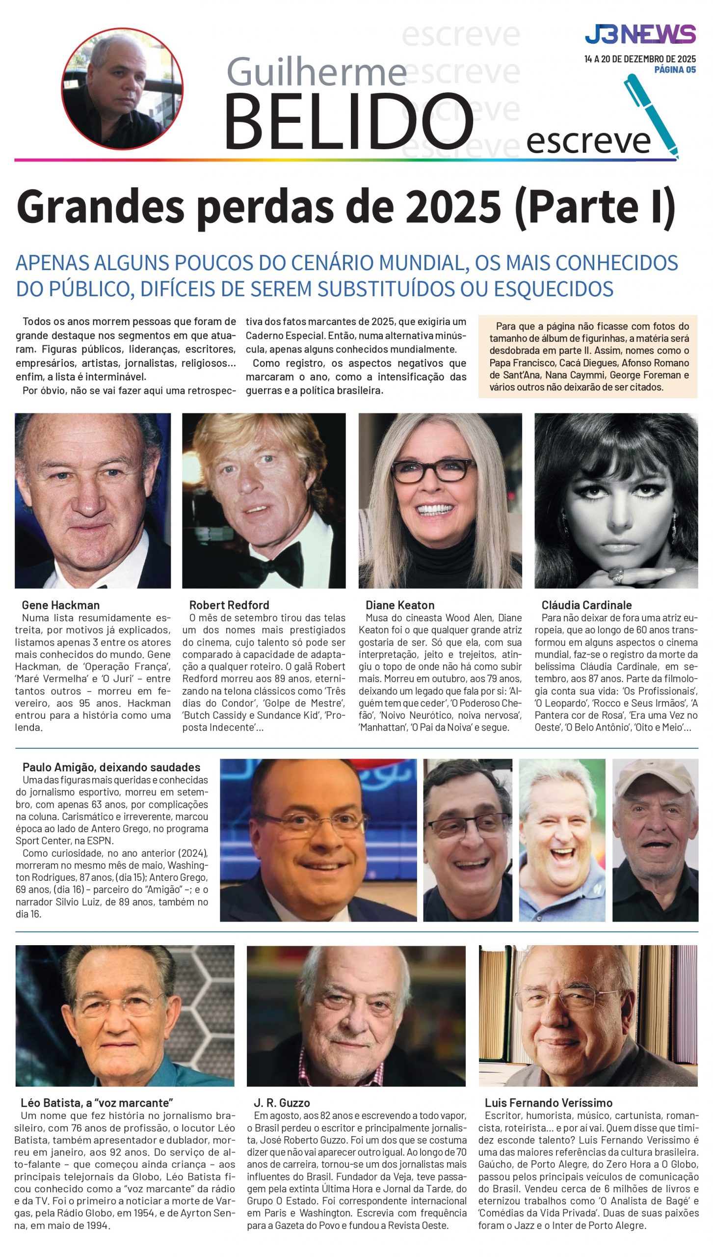 Por óbvio, não se vai fazer aqui uma retrospectiva dos fatos marcantes de 2025, que exigiria um Caderno Especial. Então, numa alternativa minúscula, apenas alguns conhecidos mundialmente.