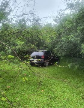 Segundo a PM, a equipe do 8º BPM realizava patrulhamento quando foi acionada por moradores, que relataram a entrada suspeita de um carro em uma propriedade rural. Os policiais seguiram até o endereço informado e, após buscas na área, localizaram um Volkswagen Gol escondido atrás de uma área de mata, sob árvores.