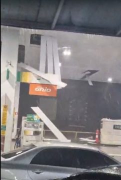 Com rajadas fortes, a cobertura de um posto de combustíveis foi destelhada. Apesar dos estragos, não houve registro de feridos no local. Cachoeiro de Itapemirim fica a cerca de 100 quilômetros de Campos dos Goytacazes (RJ).