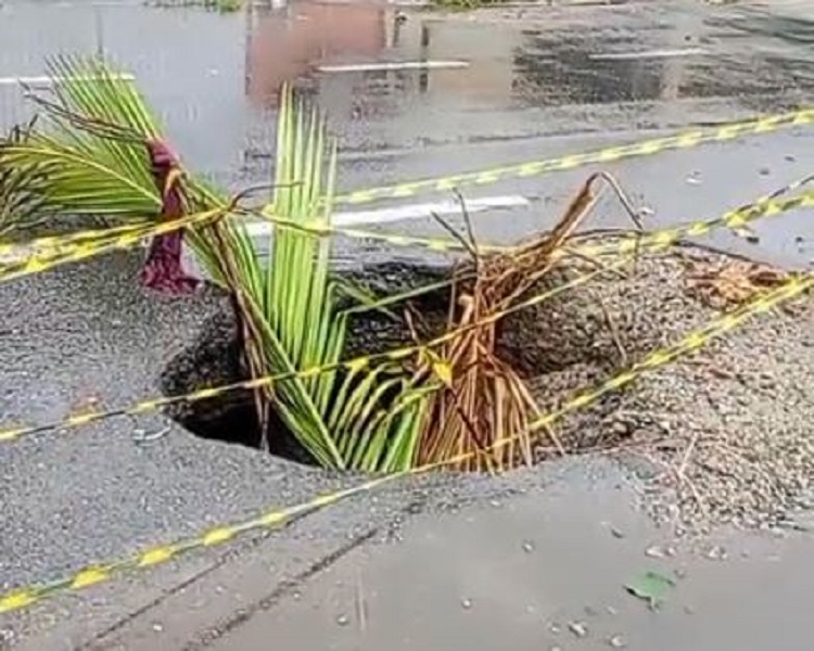 Após as intensas chuvas nos últimos dias, um buraco se formou no meio da pista da Rua Dr. Felipe Uebe, na altura da Rua Serafim Saldanha, no Parque Turf Club, em Campos, nesta segunda-feira (5). Galhos, cones e faixas foram colocados no local para sinalizar para os motoristas e motociclistas sobre a cratera e evitar acidentes.