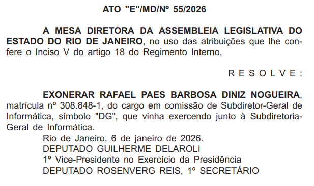 Entre os nomes, está o de Rafael Diniz, que exercia a função de subdiretor-geral de Informática. Diniz foi prefeito de Campos, reduto eleitoral dos Bacellar, entre 2017 e 2021.