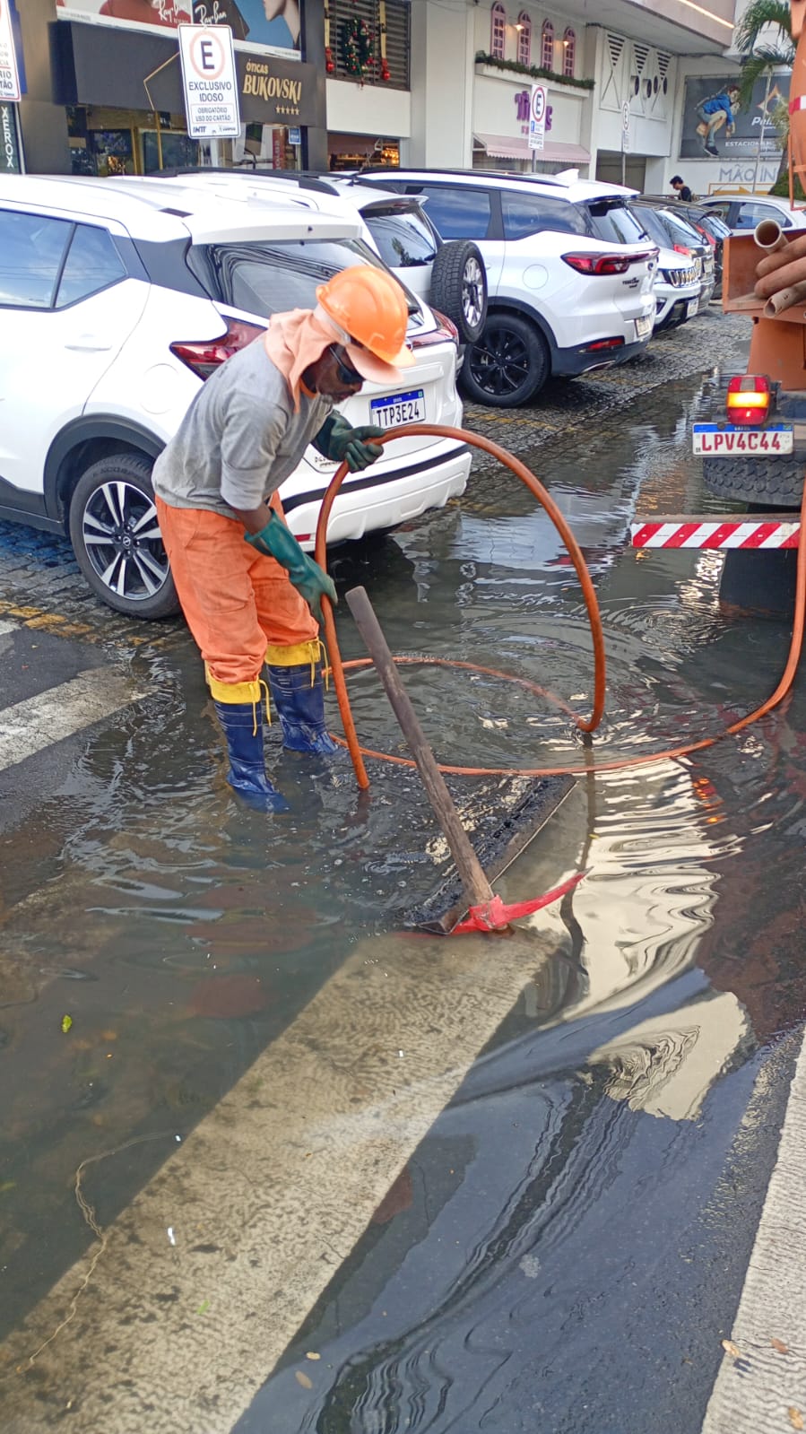 A Prefeitura de Campos realizou, na tarde desta quinta-feira (8), a desobstrução de um bueiro na Rua Voluntários da Pátria, na Pelinca. Estabelecimentos e pessoas que transitam pela área fizeram reclamações sobre o acúmulo da água suja, que causava mau-cheiro pela rua, afetando também o comércio local. Comerciantes dizem que o problema já é velho, mas se agravou há cerca de uma semana, logo após o Réveillon.