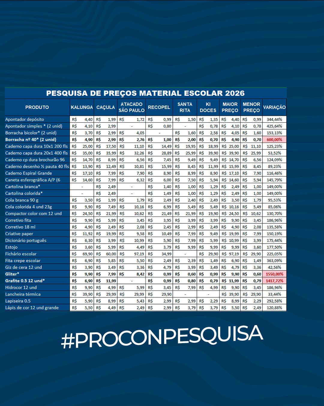 Durante a pesquisa, foram analisados 52 produtos, como caderno, borracha, lápis, hidrocor, corretivo, dicionário, caneta, cola, giz de cera e pasta com elástico. O Procon realizou o trabalho em seis lojas da cidade, entre os dias 11 e 12 de janeiro. A maior diferença registrada foi do glitter, encontrado por R$ 9,90 no maior preço e por R$ 0,60 no menor, representando uma variação de 1.550%.