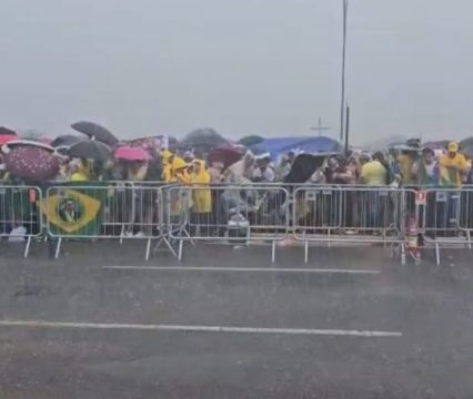 As imagens, registradas por um jornalista que estava no local, mostram o clarão provocado pelo raio e o forte estrondo logo em seguida, causando pânico entre os participantes do ato.