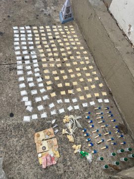 Paralelamente à condução do suspeito, parte da guarnição realizou diligências em outro ponto do bairro, onde localizou e apreendeu material entorpecente e objetos relacionados ao tráfico de drogas. Foram apreendidos 178 sacolés de cocaína, totalizando cerca de 890 gramas, 31 pinos de cocaína, com aproximadamente 155 gramas, oito frascos de substância conhecida como “loló”, R$ 195 em dinheiro e um aparelho celular iPhone.