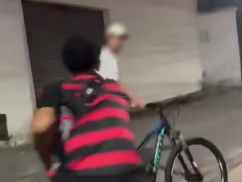Nas imagens, a mulher reage e exige que o suspeito devolva a bicicleta. “Devolve a bicicleta dele, vambora. Tá gravando. Vai morrer, rapaz. Quer roubar aqui, c***ão, safado… Verme safado, sua cara vai pro Face”, grita.