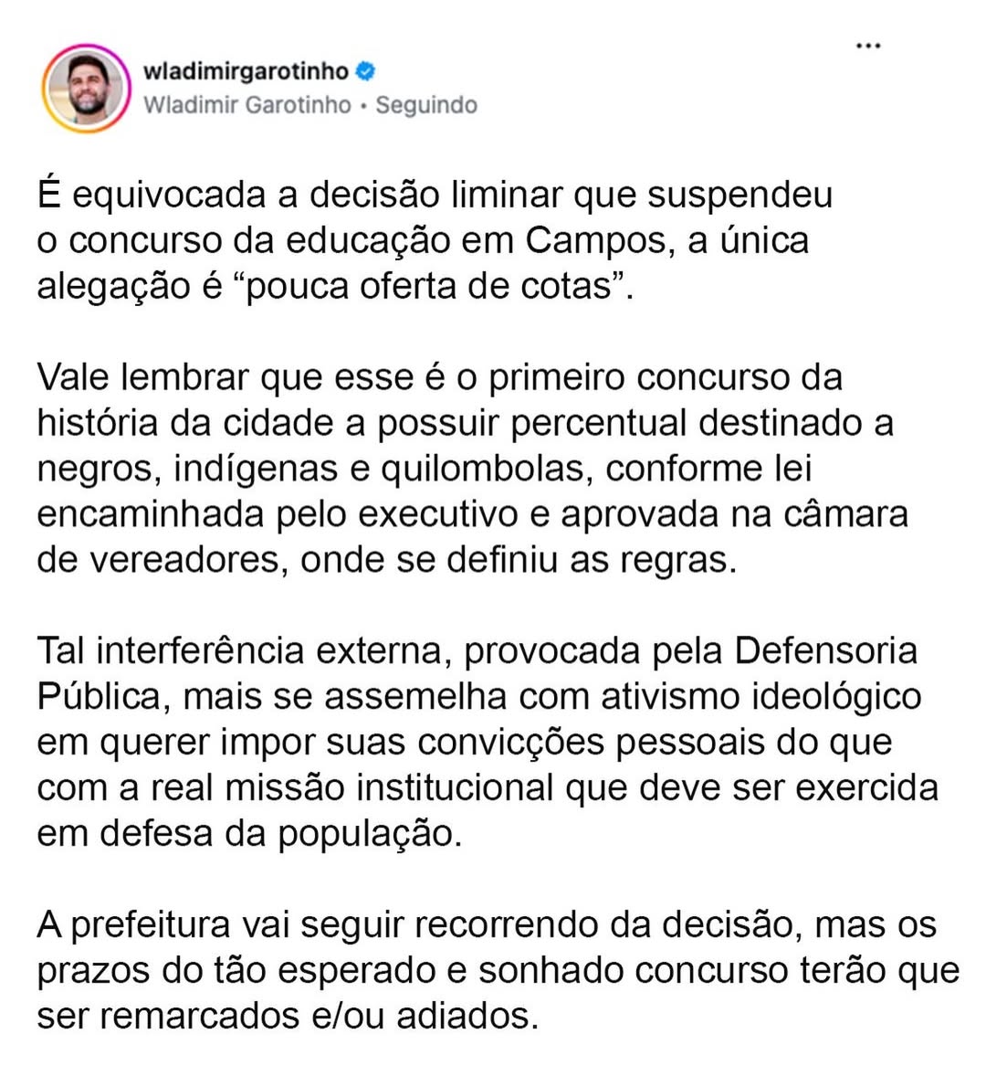 O prefeito de Campos, Wladimir Garotinho, comparou a decisão de suspensão do concurso da Educação de Campos à “ativismo ideológico”, em publicação da tarde desta sexta-feira (13), nas redes sociais. A Justiça negou o recurso da Prefeitura, que tentava retomar o concurso, suspenso por questionamentos sobre o percentual de cotas raciais previsto no edital. Na publicação, Wladimir classifica como “equivocada” a decisão liminar.