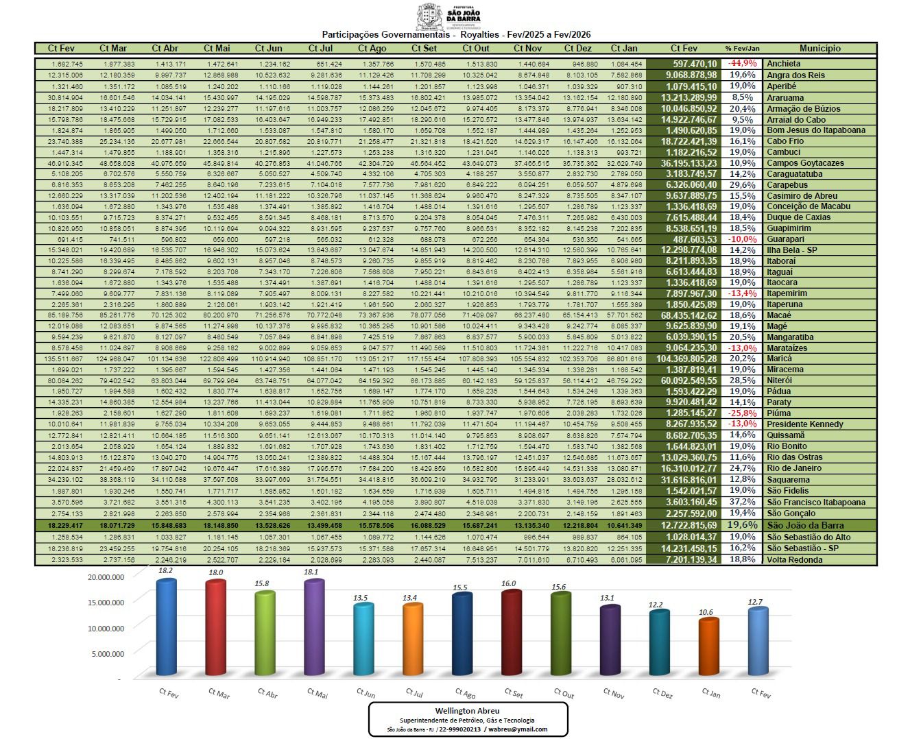 O consultor e especialista em petróleo e gás Wellington Abreu afirmou que os municípios produtores do Estado do Rio têm repasses de royalties com crescimento médio de cerca de 20% em relação ao mês anterior. Segundo ele, o aumento é resultado da recuperação da produção nacional em dezembro, impulsionada pelos campos do pré-sal da Bacia de Santos, como Tupi e Búzios, que elevaram a produção a recorde histórico de mais de 4 milhões de barris por dia. “A nova metodologia do Preço de Referência do Petróleo, aprovada pela ANP em 2025, ampliou a base de cálculo dos royalties e beneficiou todos os municípios”, disse.