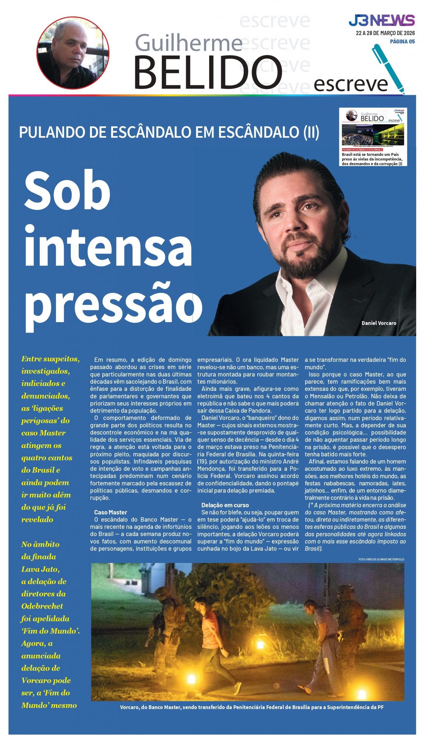 Daniel Vorcaro, o “banqueiro” dono do Master — cujos sinais externos mostra-se supostamente desprovido de qualquer senso de decência — desde o dia 4 de março estava preso na Penitenciária Federal de Brasília. Na quinta-feira (19), por autorização do ministro André Mendonça, foi transferido para a Polícia Federal. Vorcaro assinou acordo de confidencialidade, dando o pontapé inicial para delação premiada.