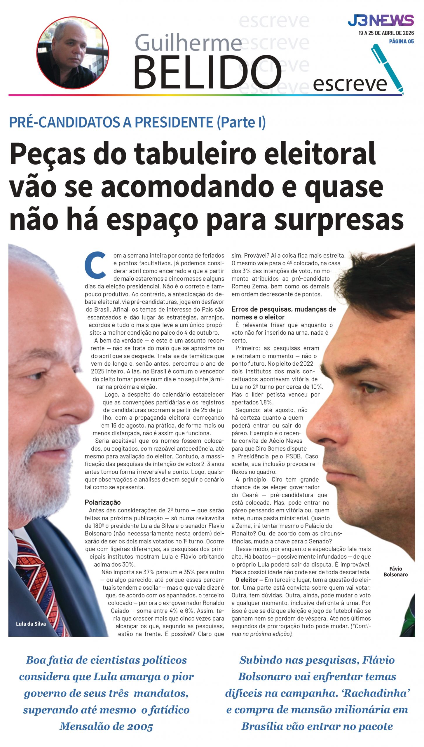 O eleitor — Em terceiro lugar, tem a questão do eleitor. Uma parte está convicta sobre quem vai votar. Outra, tem dúvidas. Outra, ainda, pode mudar o voto a qualquer momento, inclusive defronte à urna. Por isso é que se diz que eleição e jogo de futebol não se ganham nem se perdem de véspera. Até nos últimos segundos da prorrogação tudo pode mudar. (*Continua na próxima edição).