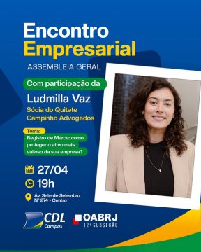 A Câmara de Dirigentes Lojistas (CDL) de Campos, em parceria com a OAB Campos, realiza na próxima segunda-feira, dia 27 de abril, mais uma edição do Encontro Empresarial, iniciativa que tem como objetivo levar conhecimento prático e estratégico aos empresários da região. Desta vez, o evento abordará um tema essencial para a sustentabilidade dos negócios: o registro de marca como ferramenta de proteção do ativo mais valioso de uma empresa.