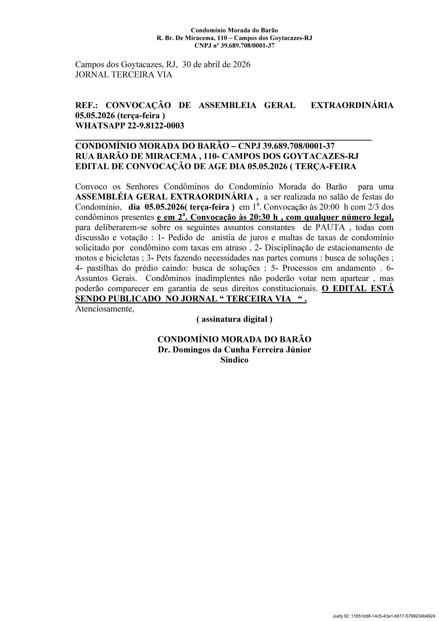 Edital de convocação de Assembleia Geral Extraordinária do Condomínio Morada do Barão, em Campos