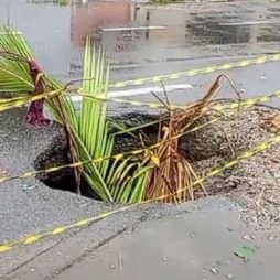Buraco se forma no meio da pista na Rua Dr. Felipe Uebe, no Turf Club
